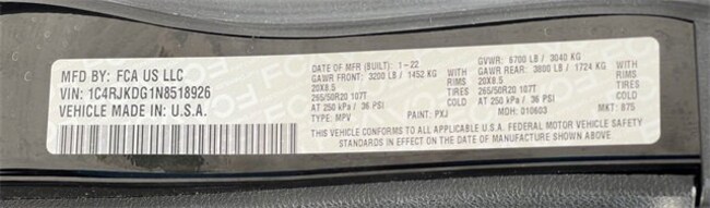 - VIN : 1C4RJKDG1N8518926