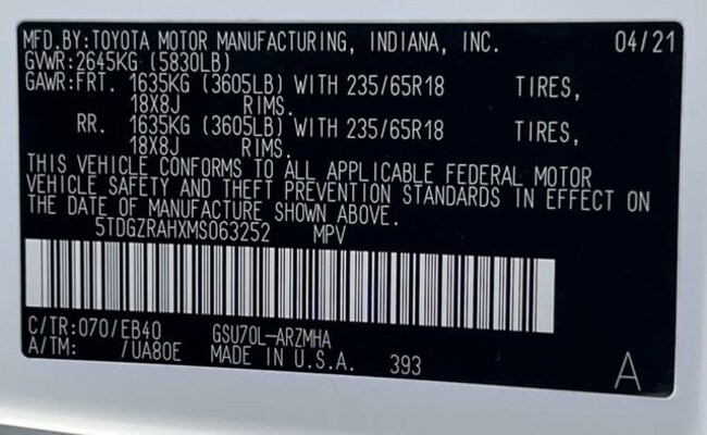 - VIN : 5TDGZRAHXMS063252